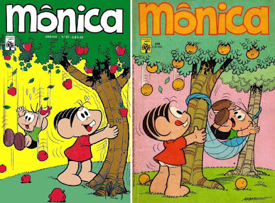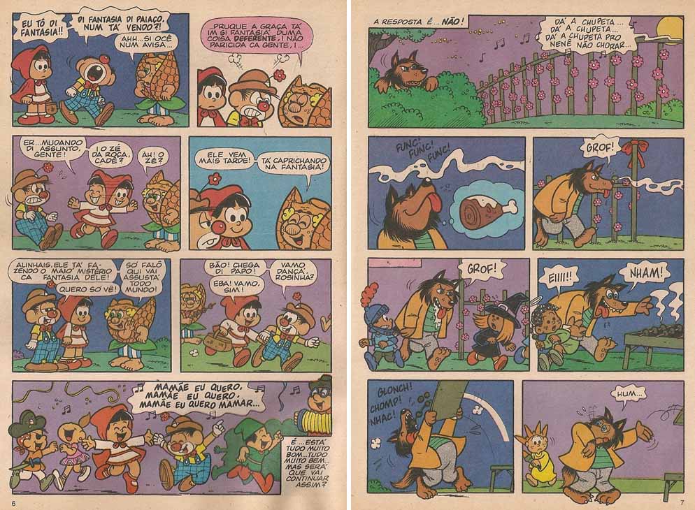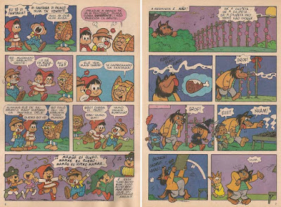 Os traços ficaram ótimos, sendo que nela teve alguns erros de cores com línguas de personagens brancas e rostos de personagens secundários marrons, representando que eram negros, como aconteceu na 5ª e 7ª página da história (página 7 e 9 do gibi, respectivamente). Não creio que a intenção que todos eles eram negros, saiu sem querer, tanto que a bruxinha apareceu de novo na 8ª página da história (página 10 do gibi) com tom de pele branca. Até que ficou legal para diferenciar. Gostava quando acontecia erros de cores. Na postagem a coloquei completa.
