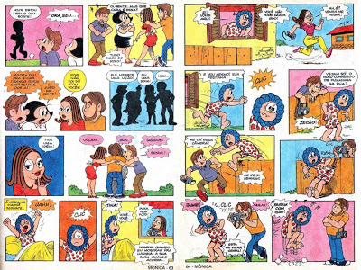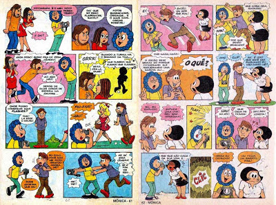 Á propósito, Marcos. Claro que nessa edição da Mônica, tem aquela história clássica "Quem Fez a Mônica Chorar?". Nela, Mônica descobre que Benardinho trocou ela por outra sirigaita. E com isso, Mônica, tristemente, tenta esconder o choro, usando óculos escuros, e Cebolinha e Cascão imaginam por que que ela estaria usando óculos escuros. Uma HQ bem bolada e que foi republicada em Almanaque da Mônica # 13 (Ed. Globo, 1989). Curiosamente na capa da edição, só a Magali, o Franjinha, o Xaveco e o Bidu não aparecem na HQ e sim o Cebolinha e o Cascão. Mas e você? Você já conhece essa história? Acha ela engraçada? Espero sua opinião.