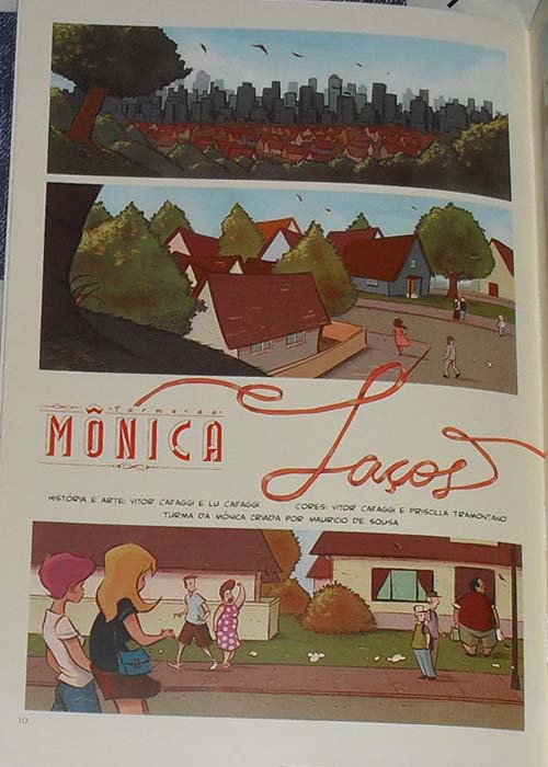 Sobre a história de "Laços", não gostei muito, achei muita enrolação. A sinopse gira em torno do Floquinho que desapareceu e, com isso, o Cebolinha e a turma vão procurá-lo. Ela vai da página 10 a 71. Mesmo começando a história na página 10, a trama do desaparecimento do Floquinho só começa a se desenvolver no final da página 18. É que nas 9 páginas iniciais, os autores resolveram colocar o Cebolinha e o Cascão correndo da Mônica pelo bairro todo, depois de um plano infalível.