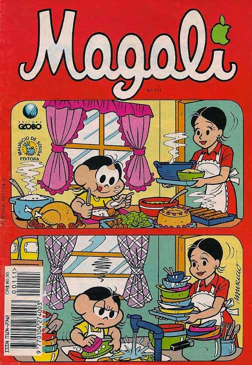 Magali também teve capa divida em 2 quadros. Nela, ao comer um superbanquete, a sua mãe a manda lavar toda a louça sozinha. Interessante a arte dessa capa com as posições das personagens e gestos nos dois quadros bem semelhantes.