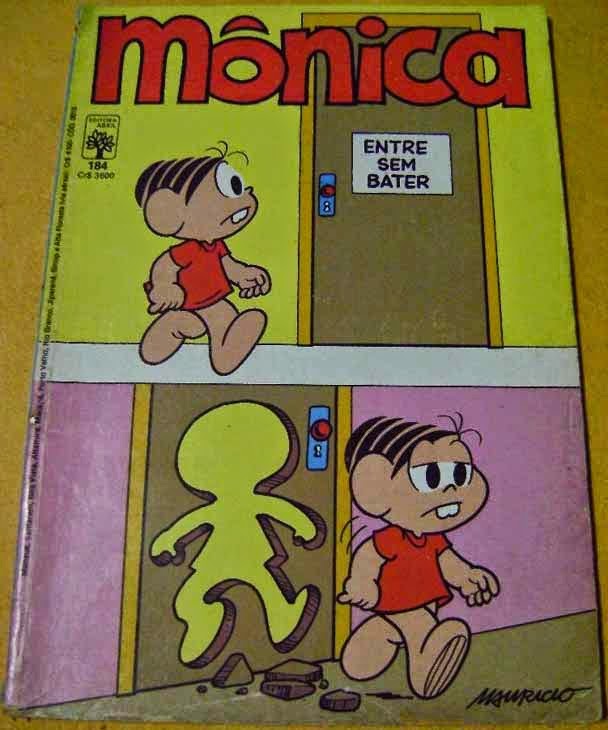 Ao ver o aviso de entrar sem bater e como é forte, a Mônica atravessa a porta, atendendo o aviso. Muito legal. Essa capa foi a única da Mônica a utilizar esse recurso, já que nem na Editora Globo ela não teve capas assim.