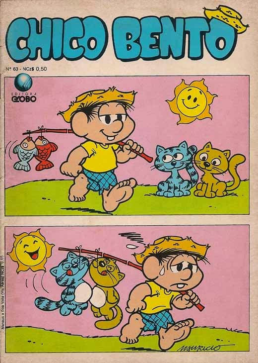 Dois gatos surpreendem o Chico Bento e devoram os peixes que ele havia acabado de pescar. Essa pelo fato do fundo ser branco, ficou parecendo de fato uma verdadeira tirinha, só faltaram colocar um código de histórias na lateral.