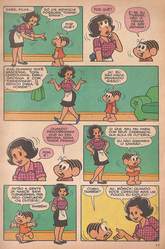 Prova também isso na parte de se Mônica tivesse torneirinha ao nascer e descobrissem que era menina anos mais tarde, que a mãe não saberia o que fazer com bola e carrinhos que tinha ganho porque as meninas não podiam brincar com essas coisas e não ganharia o Sansão porque menino não brinca com bichinho de pelúcia. Hoje Mônica poderia fazer tudo isso normalmente. Impublicável por mostrar um assunto assim de cunho sexual e acharem que é inapropriado para crianças e ordens do que é certo ou errado de meninos e meninas fazerem, fora aparecer Cebolinha e Mônica mijando no chão, envolver religião com "Papai do Céu" e Mônica surrar o Franjinha.